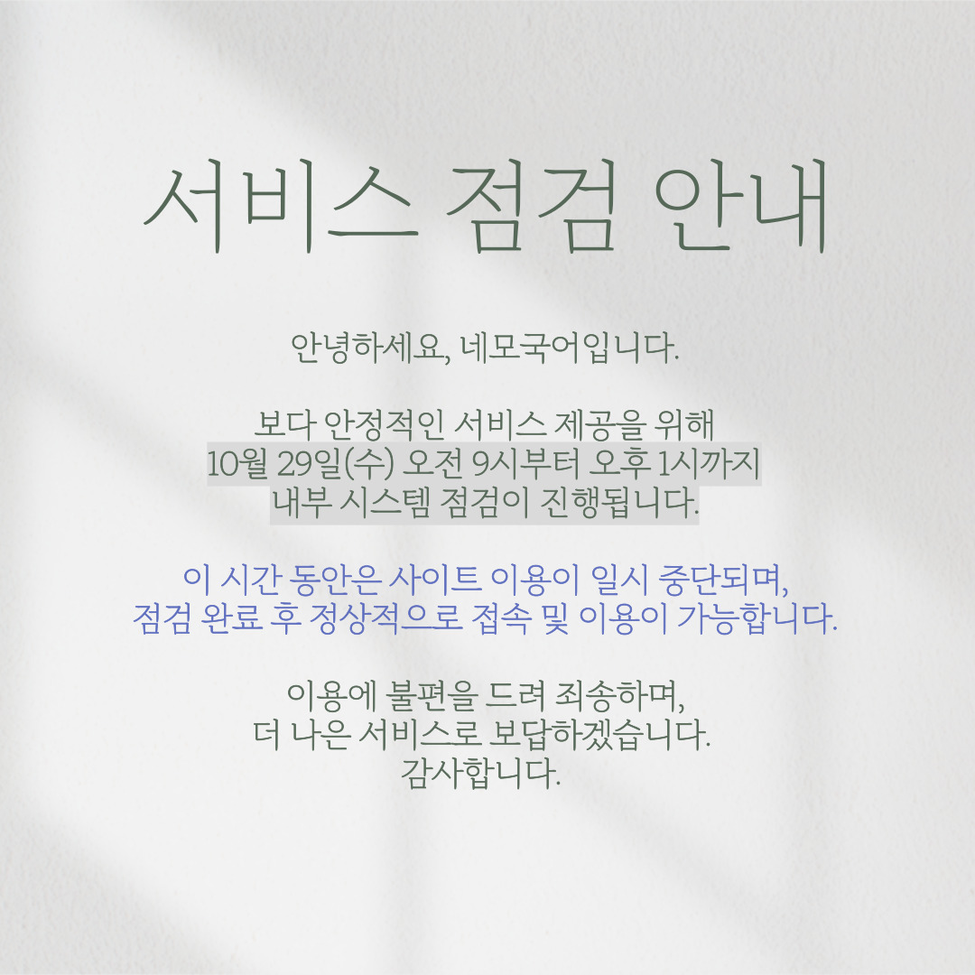 안녕하세요, 네모국어입니다. 보다 안정적인 서비스 제공을 위해 10월 29일(수) 오전 9시부터 오후 1시까지 내부 시스템 점검이 진행됩니다. 이 시간 동안은 사이트 이용이 일시 중단되며, 점검 완료 후 정상적으로 접속 및 이용이 가능합니다.